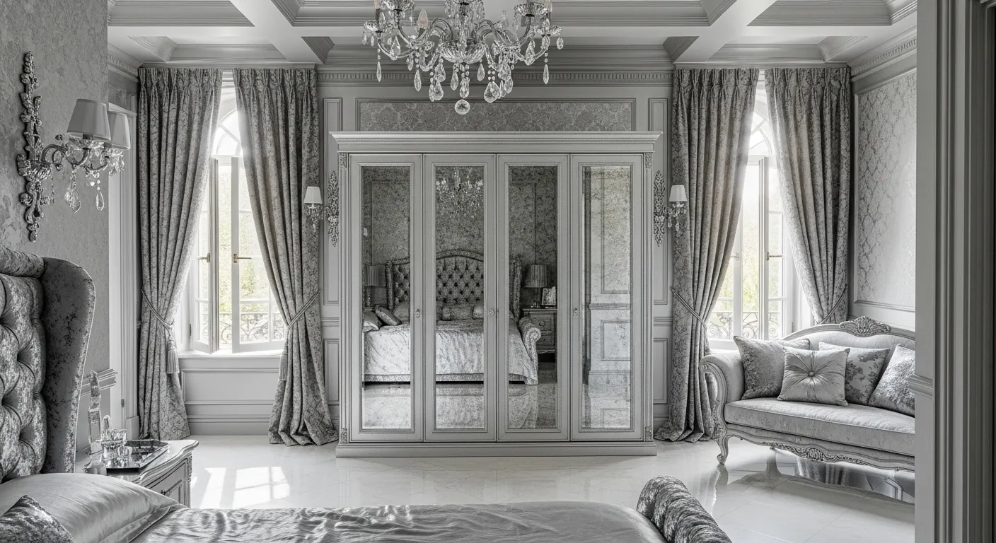 Step into a realm of tranquility with this classic luxury bedroom, draped in stunning shades of silver. The ornate bed and plush textures create an inviting atmosphere that whispers sophistication. Soft grey curtains frame the room, letting in just the right amount of natural light, while the mirrored accents enhance the space, making it feel larger and airier. For a touch of elegance, consider layering different textures—think velvet throws and silk cushions—to elevate your own bedroom. You’ll love how these small details can dramatically enhance the overall mood!