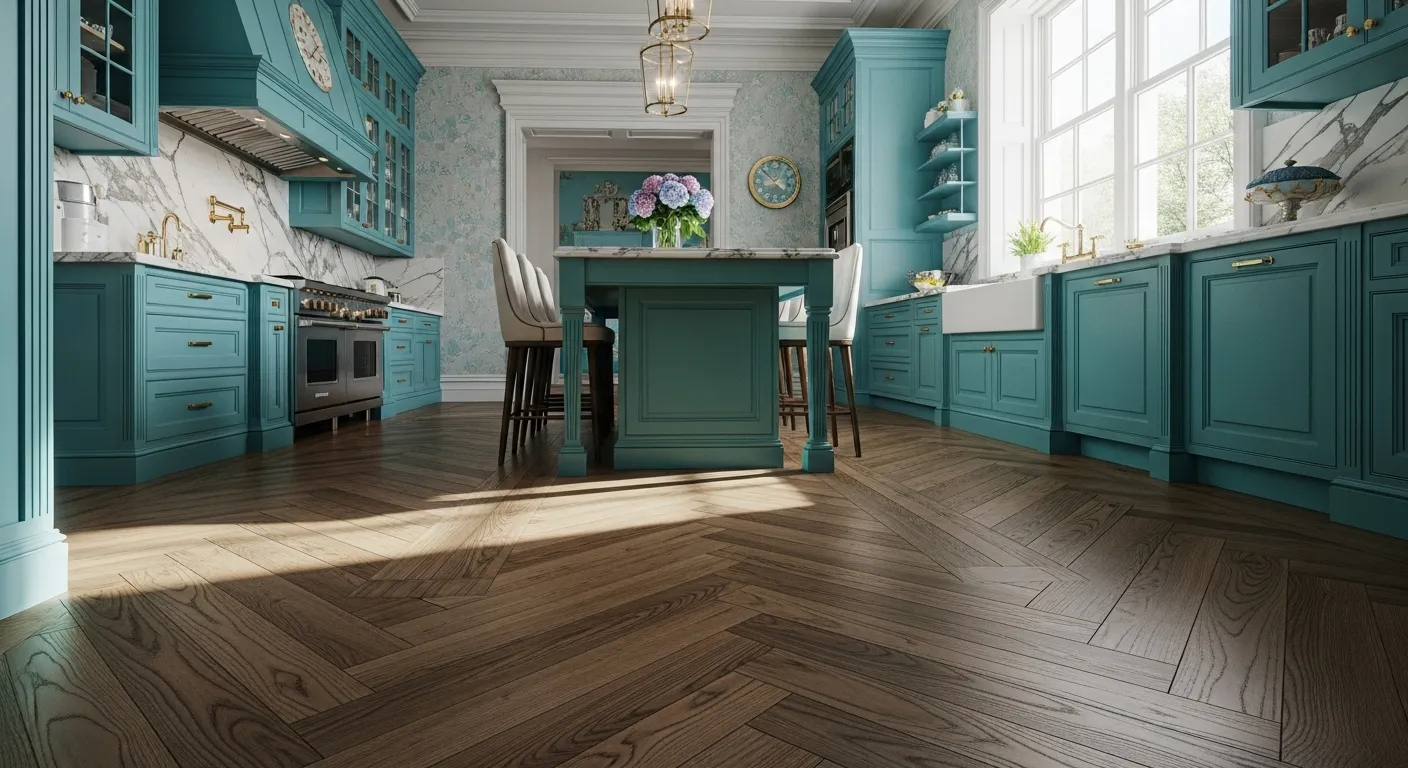 Imagine stepping into a kitchen that feels like a serene retreat! This classic luxury space, drenched in tranquil turquoise, invites warmth and elegance all at once. The beautiful wooden flooring adds a cozy touch, perfectly balancing the vibrant cabinetry. For a practical styling tip, consider adding fresh flowers or greenery to the countertop. It not only enhances the ambiance but also brings a splash of life to your everyday cooking experience. You’ll love how this color palette transforms the atmosphere, making it a joyful place to gather and create delicious memories!