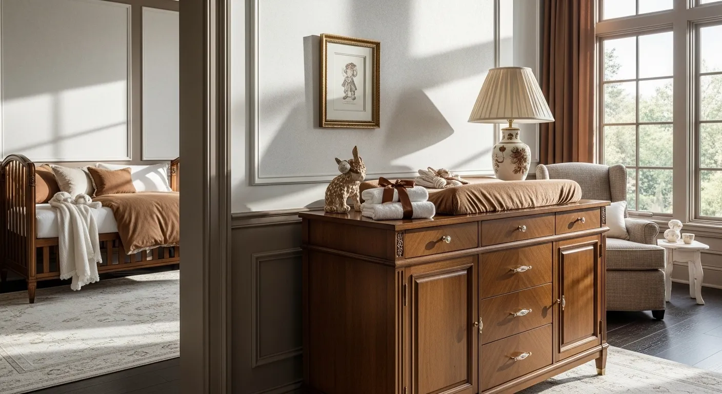 Welcome to the warm embrace of this classic luxury nursery! Painted in soft, warm brown tones, the space feels inviting and soothing, perfect for your little one. The elegant furniture, like the beautifully crafted crib and rich wooden dressers, adds a touch of sophistication while keeping comfort in mind. A practical tip? Incorporate plush textiles, like a soft area rug or cozy throws, to enhance the warmth and texture of the room. This smart layering not only makes playtime comfortable but also invites snuggles during storytime!