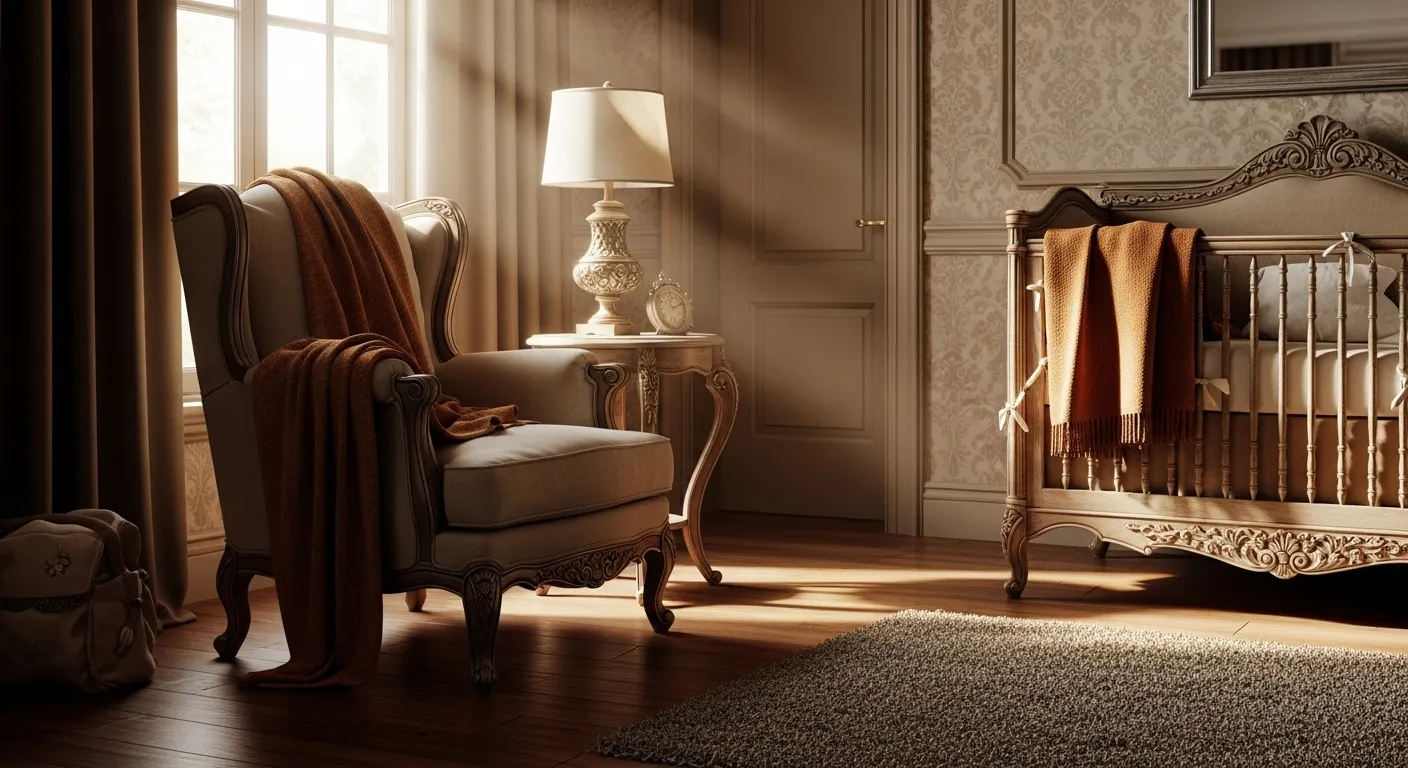 Imagine stepping into a nursery that feels like a warm embrace! This classic luxury room, draped in rich warm brown tones, is not just beautiful but super inviting. The plush textures of the armchair, adorned with cozy blankets, create a perfect spot for snuggling. The elegant crib, with its intricate detailing, adds a touch of sophistication. To enhance the warmth, consider adding soft, layered lighting that can brighten up those late-night feedings. This space radiates comfort and elegance, making it a delightful retreat for both you and your little one!