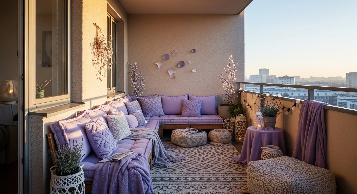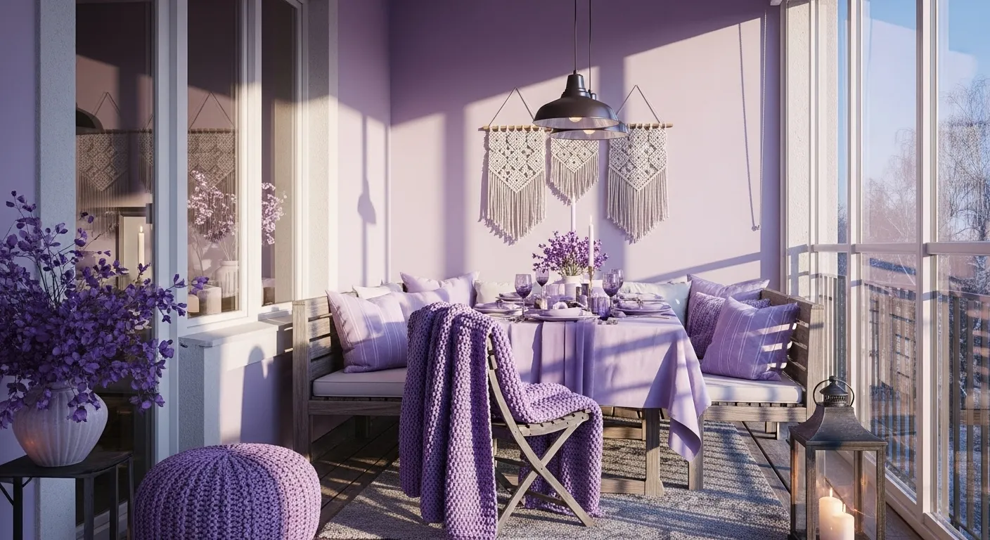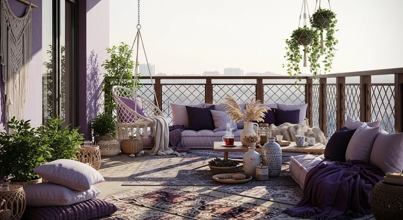 Imagine sipping hot cocoa while wrapped in a soft lavender blanket on your bohemian-styled balcony! The warmth of plush cushions and a fluffy throw invites you to snuggle up and enjoy the season. This dreamy lavender color palette creates a soothing atmosphere, perfect for winter evenings. Add some potted plants for a touch of greenery and don’t forget a few natural elements, like pinecones or wooden accents, to ground the look. For an extra cozy vibe, hang a macramé wall piece to tie the whole space together!