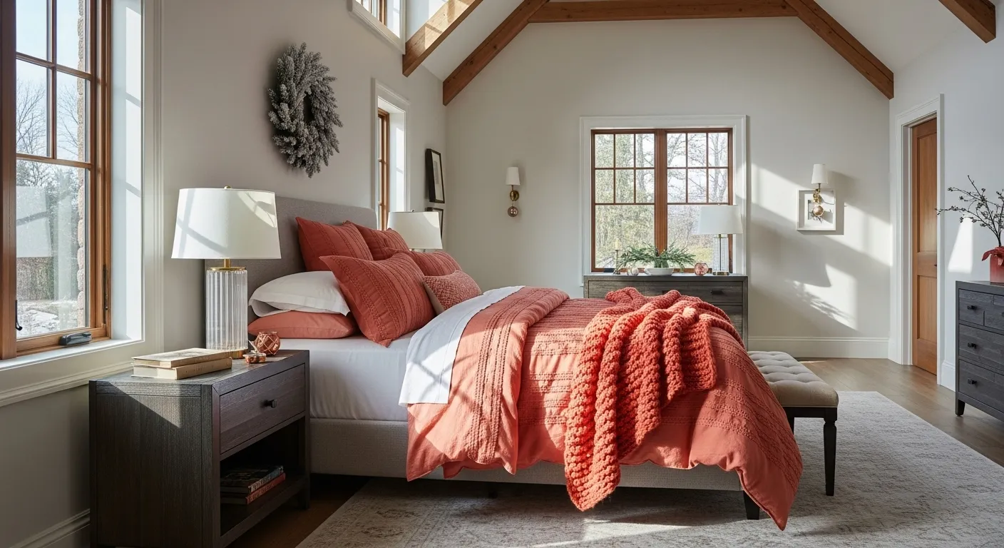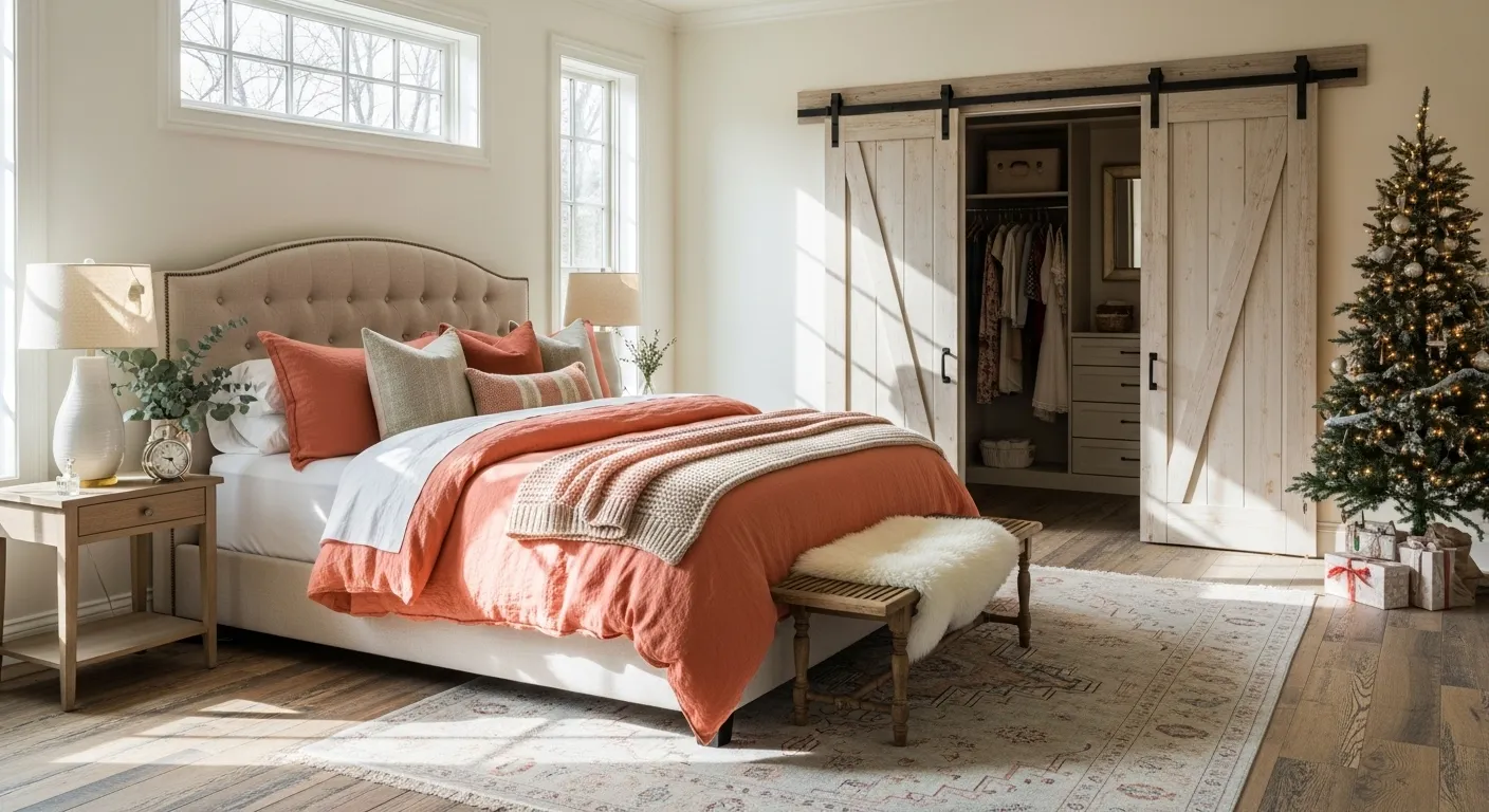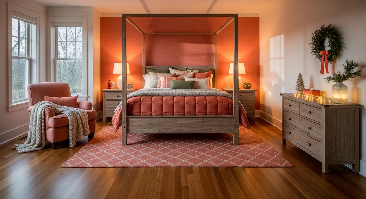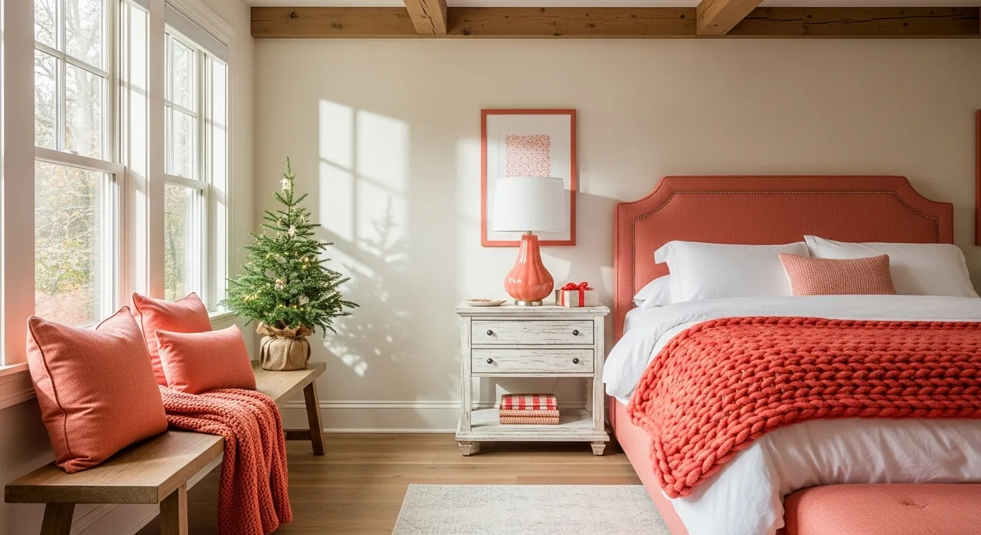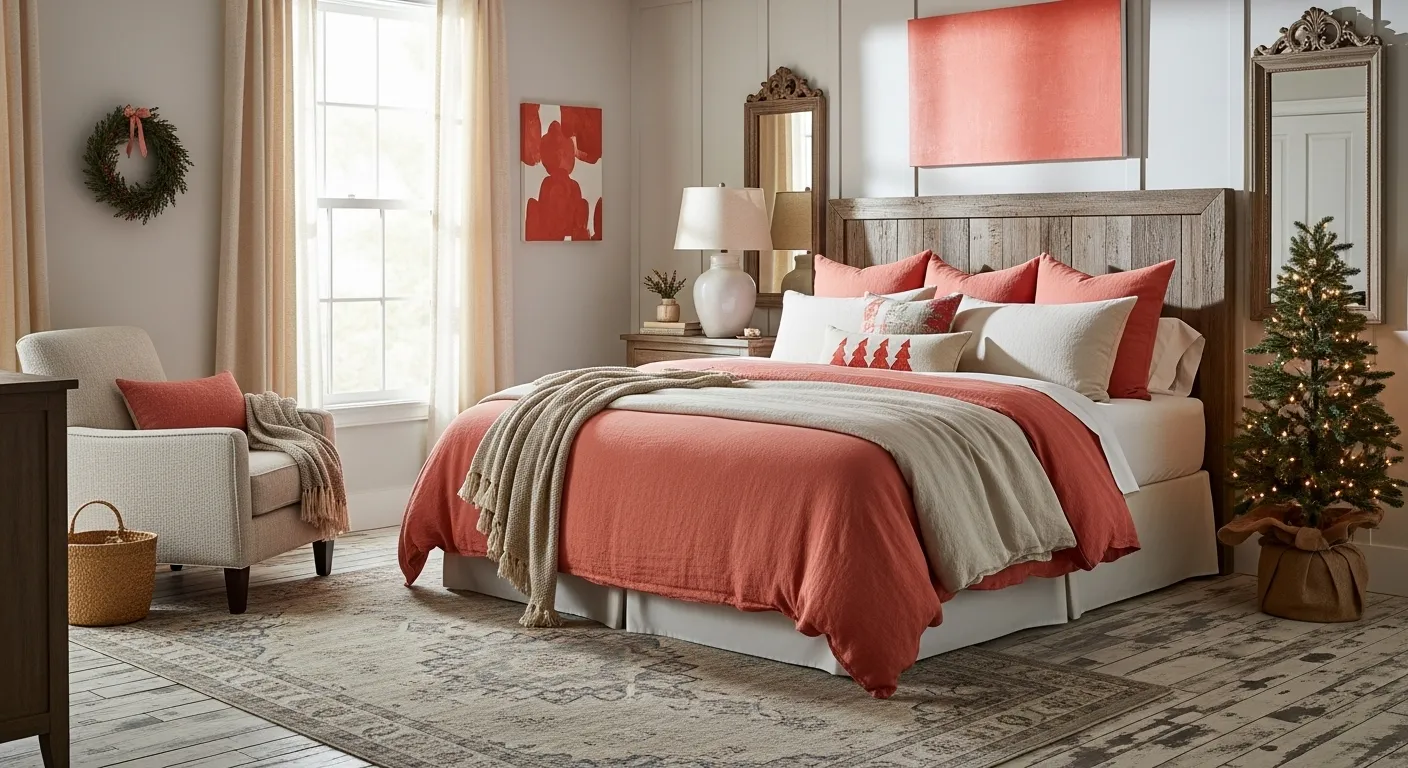 So, why not bring a splash of coral into your farmhouse bedroom this Christmas? It’s a color that beautifully complements the rustic elements of your space while creating an atmosphere of warmth and cheer. You’ll be glad you did!
