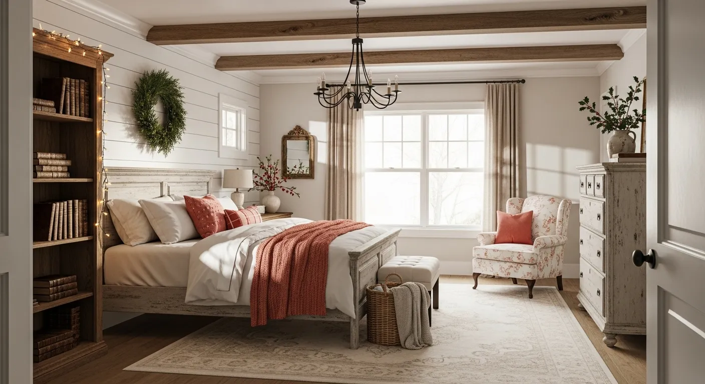 Get ready to feel the holiday magic in this cozy farmhouse bedroom! With its charming coral accents, like the knitted throw and decorative pillows, this space radiates warmth and joy. The soft wood tones in the furniture and beams add an inviting touch, while the festive wreath and twinkling lights bring in that Christmas spirit. A great styling tip? Layer different textures, like a chunky knit blanket on the bed or a floral armchair, to create a warm, inviting atmosphere that’s perfect for snuggling up with a good book!