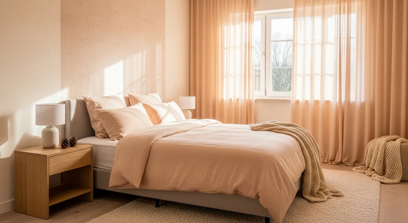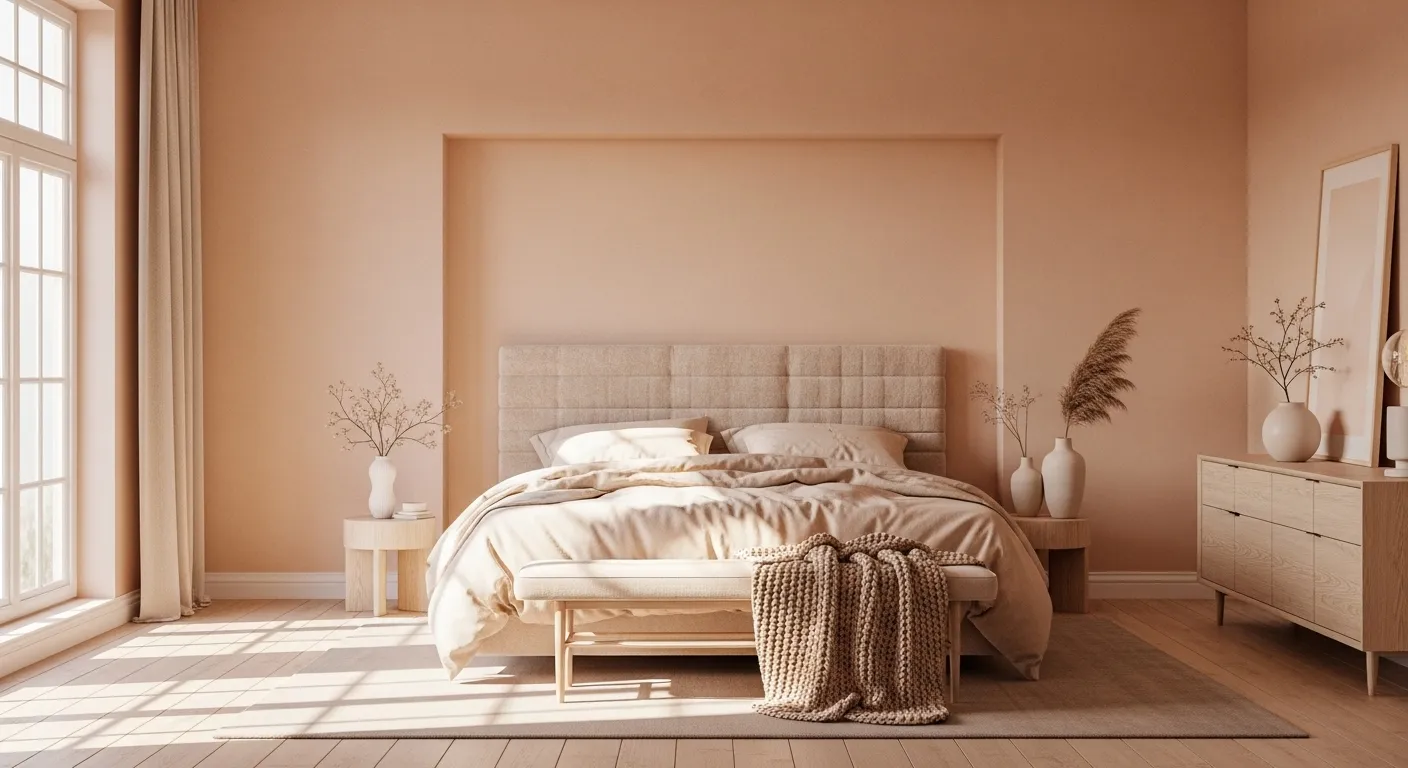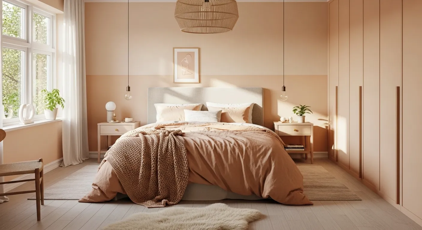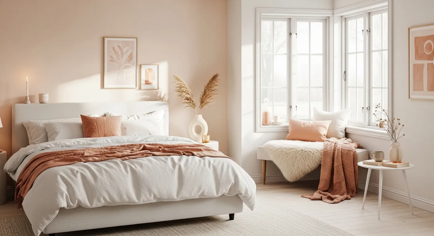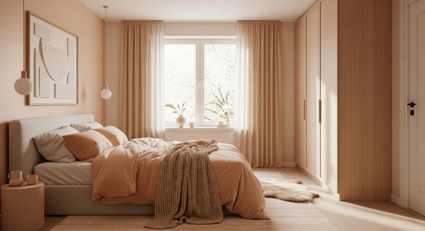 Imagine curling up in a cozy Scandi-inspired bedroom this winter! The creamy peach walls create a warm, inviting atmosphere that’s perfect for those chilly nights. Pair this lovely palette with soft linens and textured throws for a snug vibe. Don’t forget to add a touch of nature, like a simple vase with dried grasses, to bring in that organic feel. For a quick styling tip, layer different textures on your bed—think fluffy pillows and a chunky knit blanket—to elevate your cozy sanctuary even more!