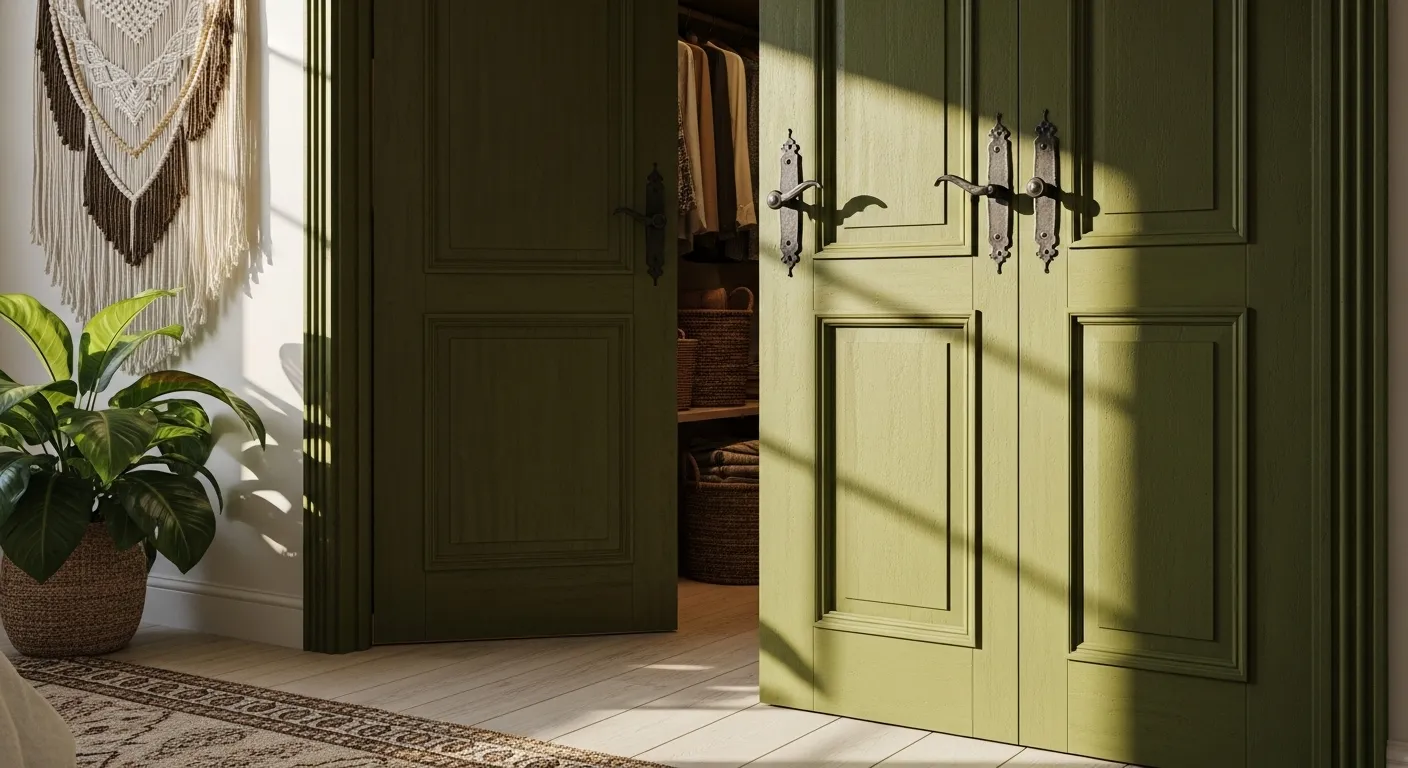 If youâre dreaming of a cozy bohemian bedroom, you can’t go wrong with a rich olive green color palette. The stunning green doors add an earthy vibe that brings the outdoors in, creating a serene atmosphere. Pair them with warm, textured macrame wall art and lush plants for that perfect boho touch. A great styling tip? Use natural materials like woven baskets for storageâit not only keeps things organized but enhances the overall aesthetic. Trust me, this calming color will make your space feel like a personal sanctuary youâll love retreating to every day!