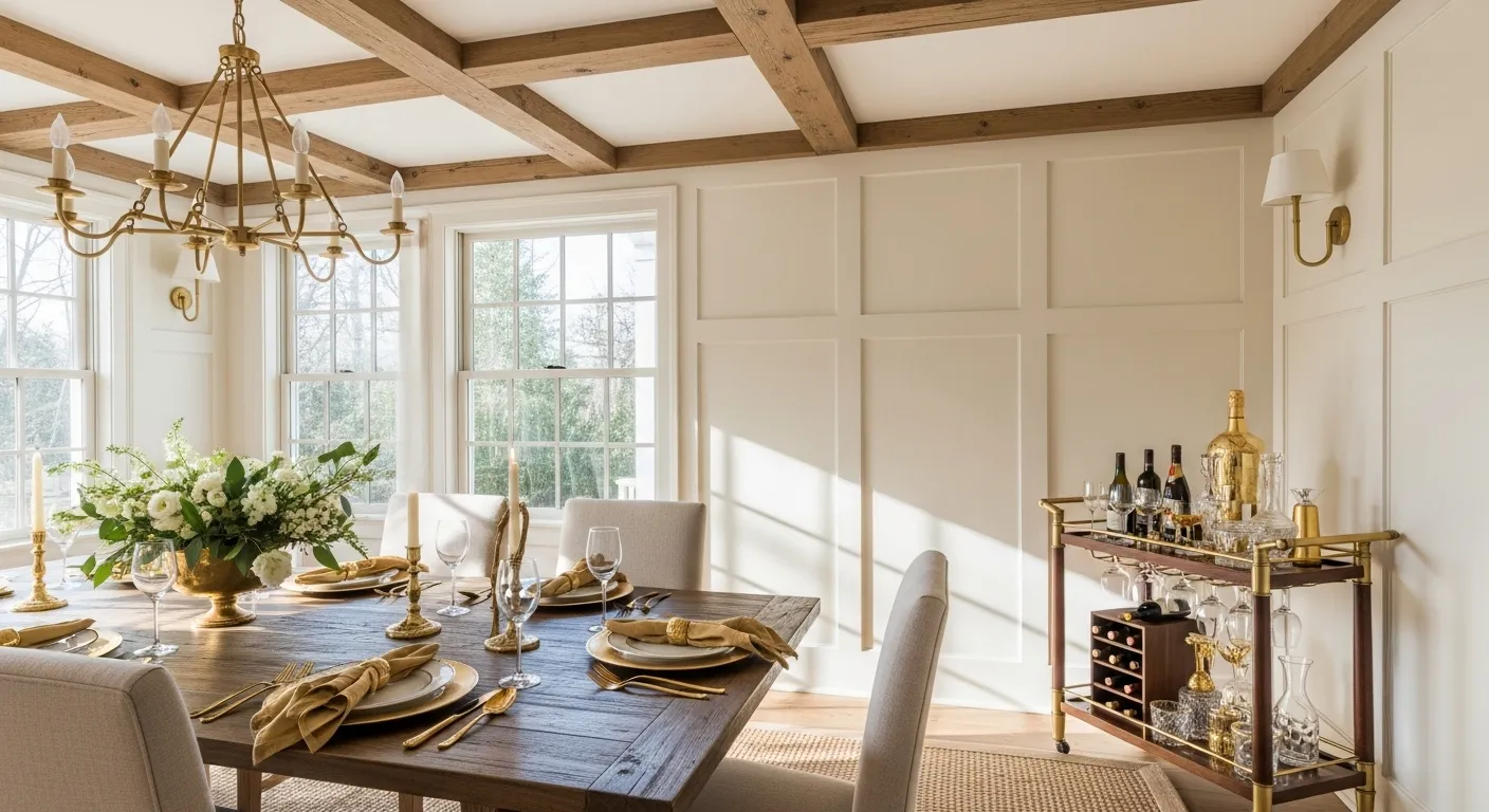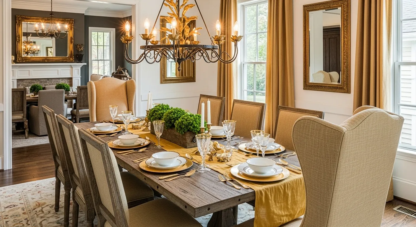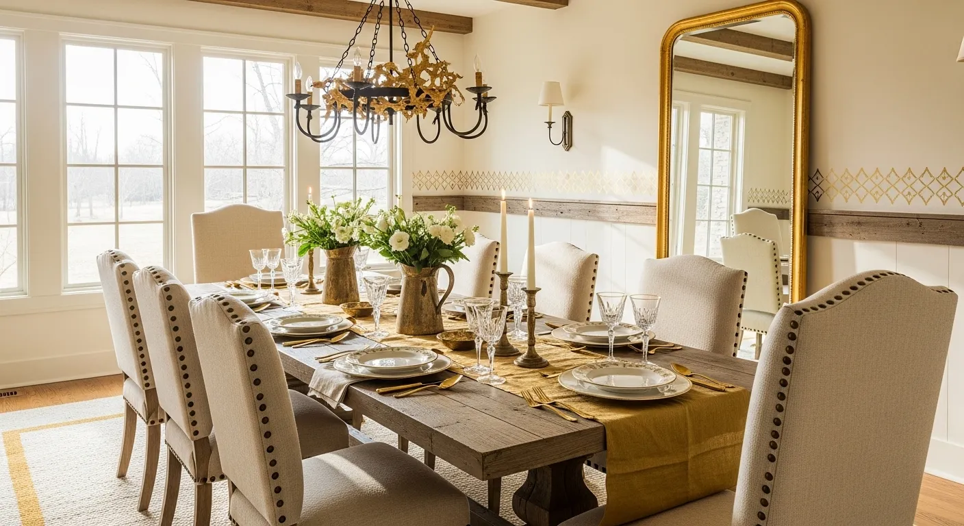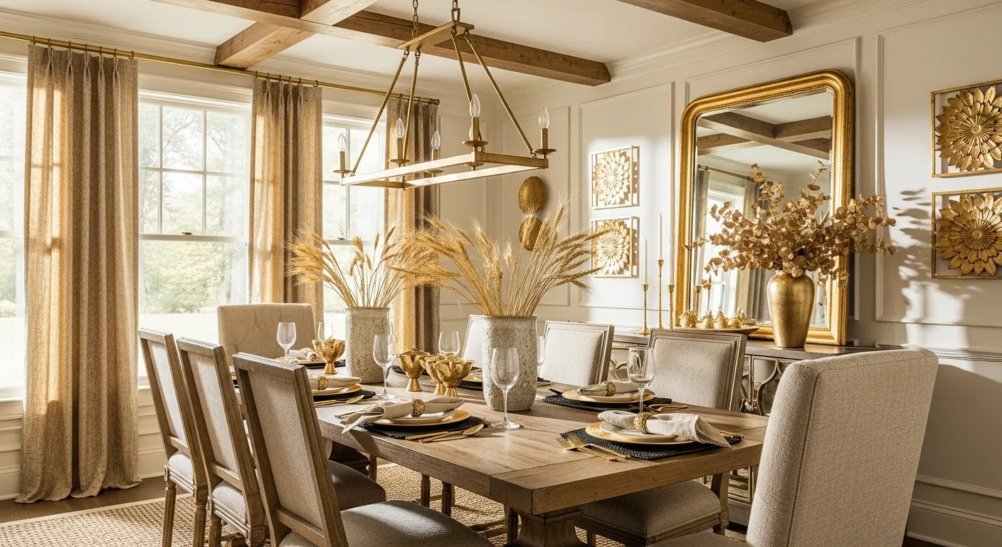 This inviting farmhouse dining room is a true gem! The warm gold accents instantly elevate the rustic wooden table, creating a cozy and elegant atmosphere. Tall, gold-draped curtains gracefully frame the windows, allowing natural light to dance around the space. A simple yet stunning styling tip? Add a touch of greenery with a fresh centerpiece—like a small potted plant or a beautiful arrangement of herbs—to complement the earthy tones. It’s all about that effortless charm that makes you feel right at home!