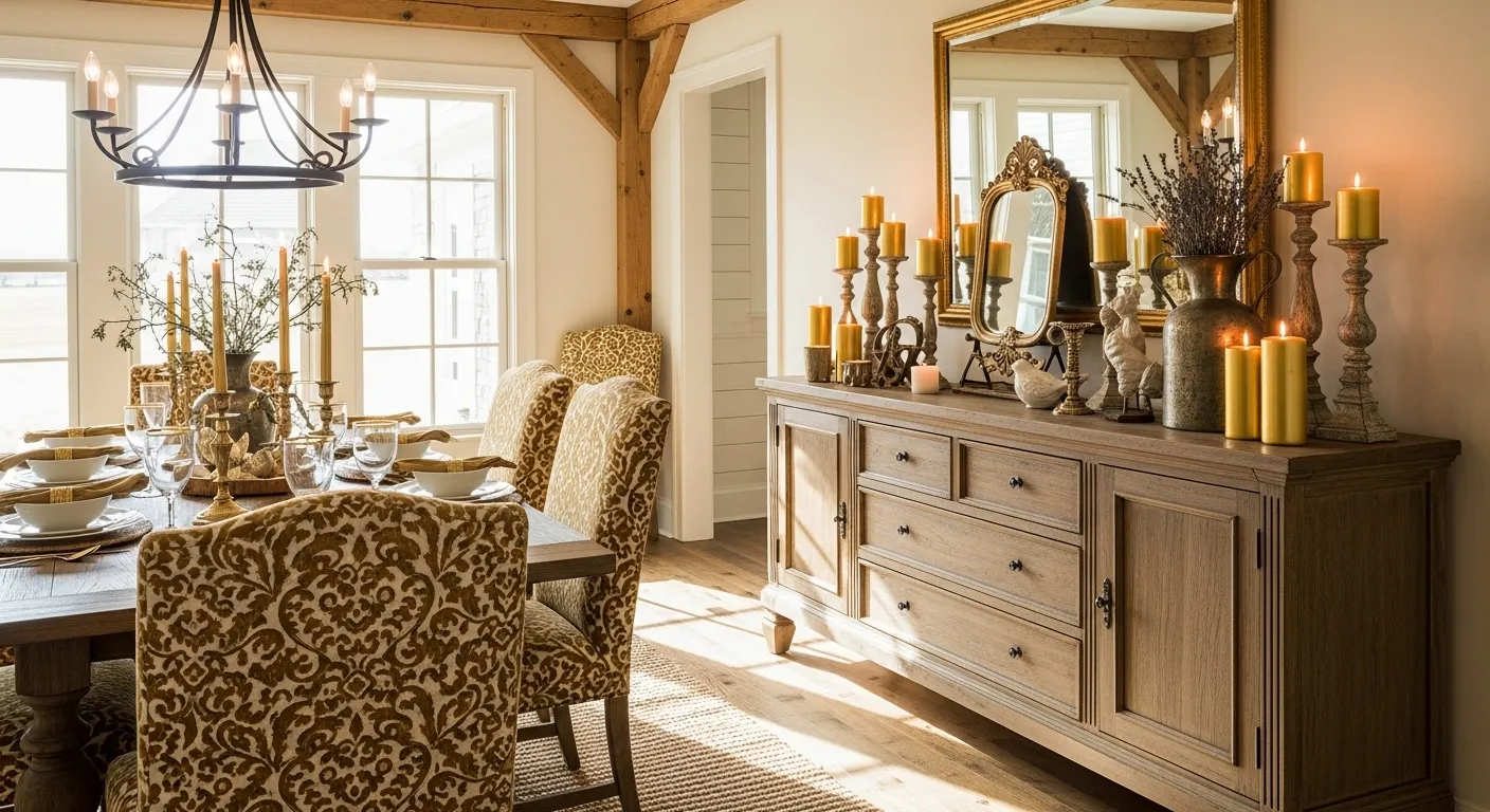 This farmhouse dining room is pure bliss with its inviting atmosphere and stunning gold accents! The rich golden hues in the chair upholstery and candle holders create a warm, cozy glow, perfect for everyday gatherings. The rustic wooden table paired with elegant dinnerware sets the scene for memorable meals. To enhance the ambiance, try layering different heights in your candle displays—mix tall candlesticks with shorter ones for an eye-catching centerpiece. You’ll love how this simple touch transforms the space into a welcoming retreat for family and friends!