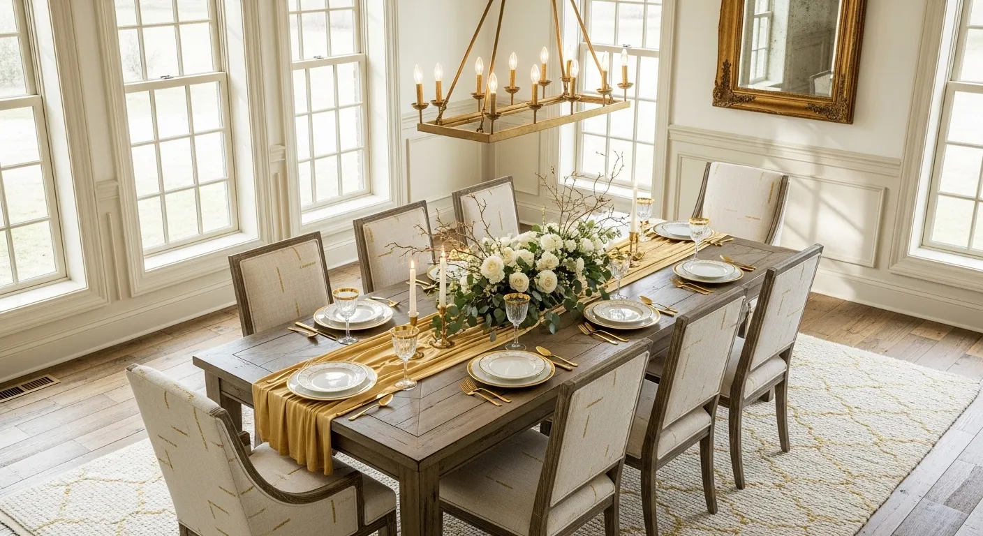 Imagine gathering around this stunning farmhouse dining table, where every meal feels like a celebration! The warm gold accents beautifully complement the rustic wood, creating a cozy yet elegant atmosphere. With a lovely floral centerpiece and golden tableware, it invites you to linger over good food and great company. For an extra touch of charm, consider layering your table with a soft runner in a muted gold or cream. It’ll add warmth and texture, making your dining experience feel even more special!
