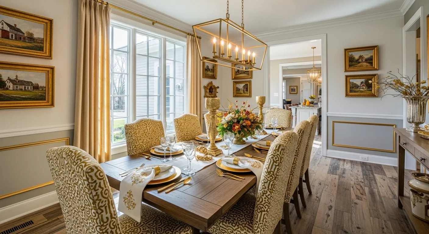 Imagine sitting down in this stunning farmhouse dining room, where the golden accents create a warm and inviting atmosphere. The rich wooden table paired with elegant gold table runners and chic centerpiece flowers makes every meal feel special. Natural light floods in through the large windows, enhancing the cozy vibe. For a little extra flair, consider adding gold-toned flatware and soft textiles to complement the overall palette. Trust me, your dining experience will be transformed into something truly magical!