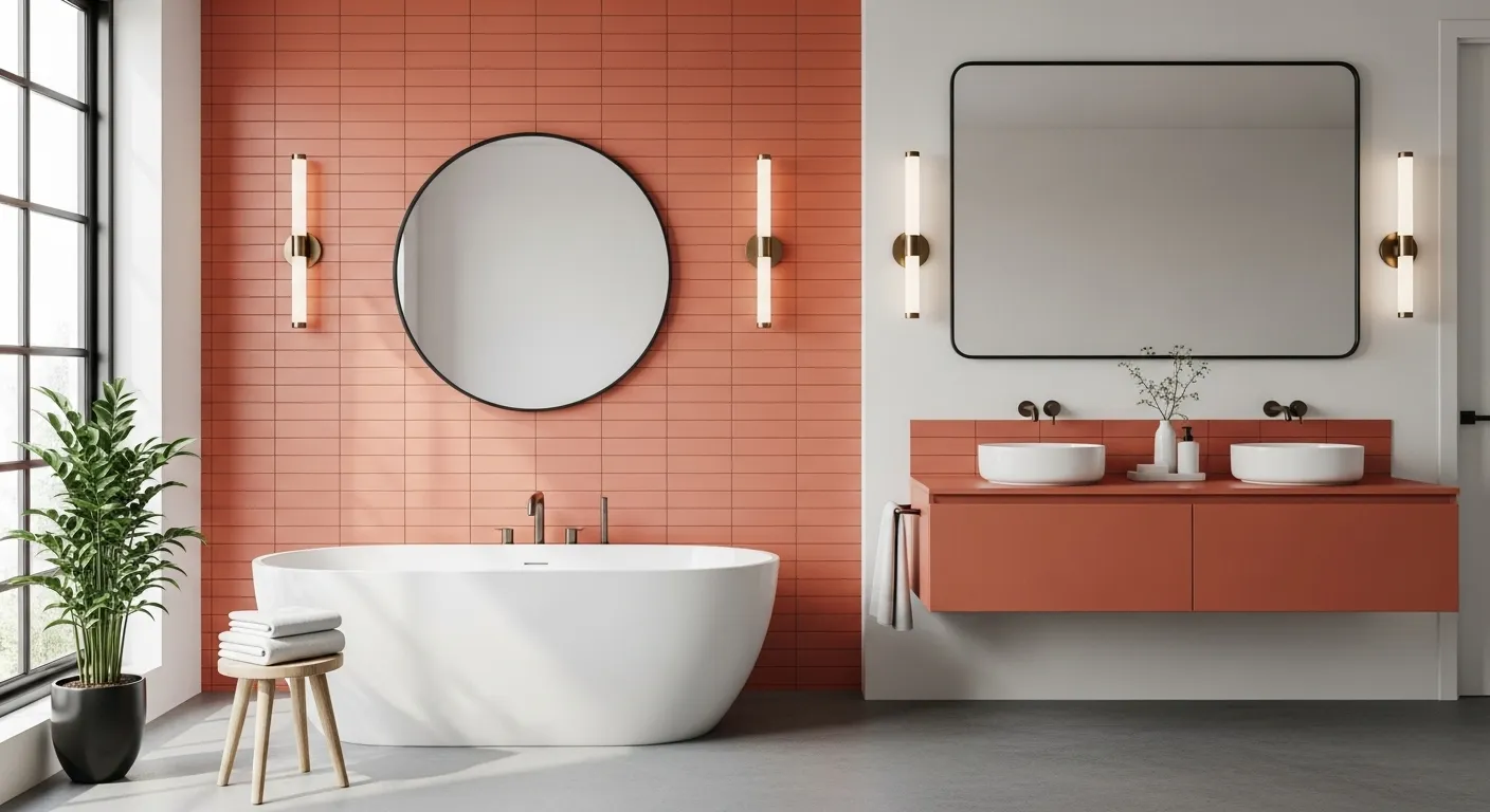 Step into a world of relaxation with this stunning modern bathroom! The coral tile walls instantly bring warmth and happiness, making it the perfect everyday retreat. The sleek white tub contrasts beautifully with the vibrant color, while the round mirror and elegant sconces add a touch of sophistication. To enhance this cozy atmosphere, consider adding some greeneryâlike a lovely potted plantâto breathe life into the space. Trust me, itâs all about creating a serene vibe that youâll look forward to every single day!