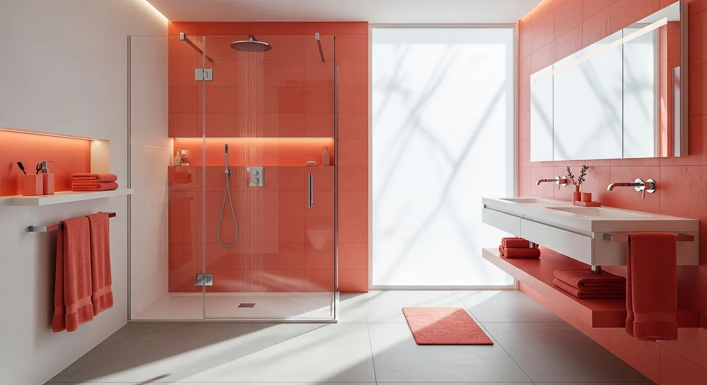 Imagine stepping into a bathroom that radiates warmth and cheer! This modern space is brought to life with a vibrant coral palette, creating an inviting atmosphere that lifts your spirits every day. The sleek glass shower and minimalist fixtures complement the bold coral tiles beautifully. For a practical styling tip, consider adding plush coral towels and accessories to enhance that cohesive look. Itâs all about those little details that make your bathroom feel like a personal oasis!