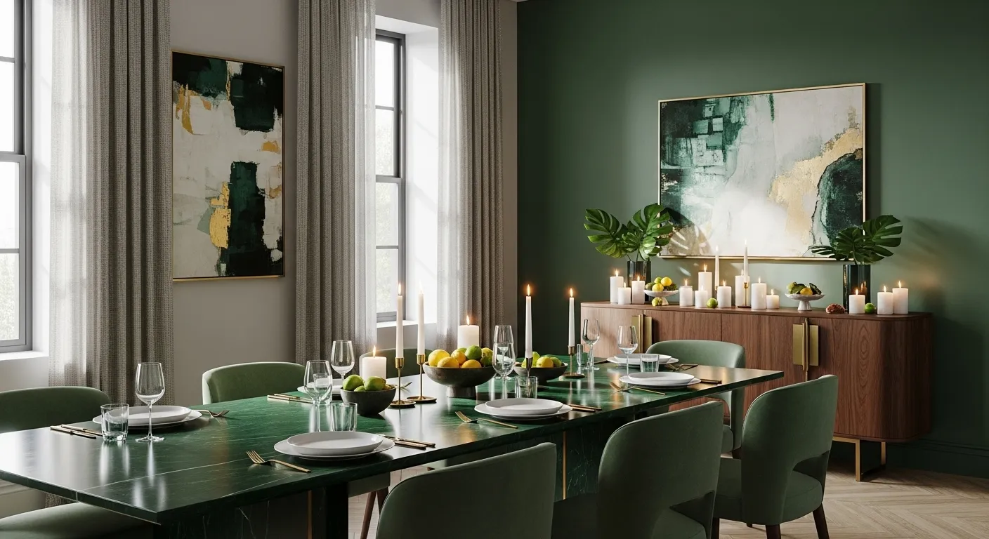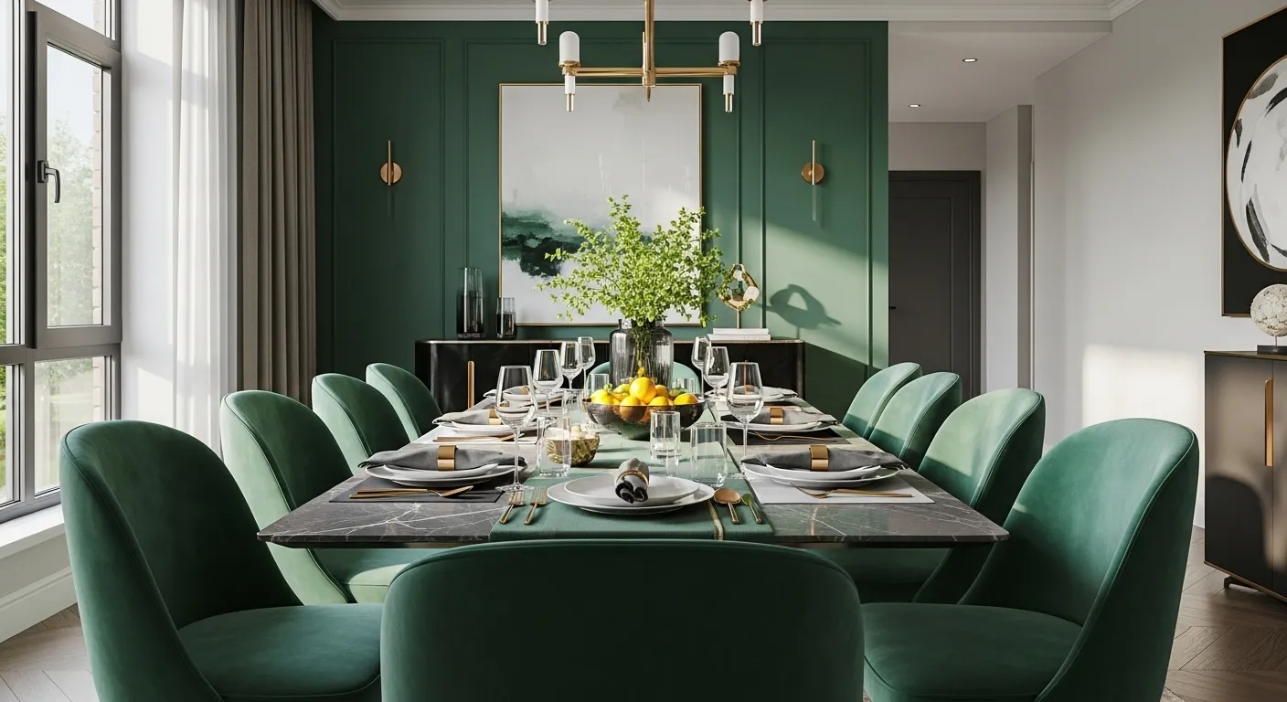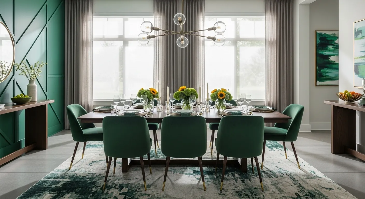 Stylish modern dining room with emerald green decor, summer vibes, and elegant table setting.