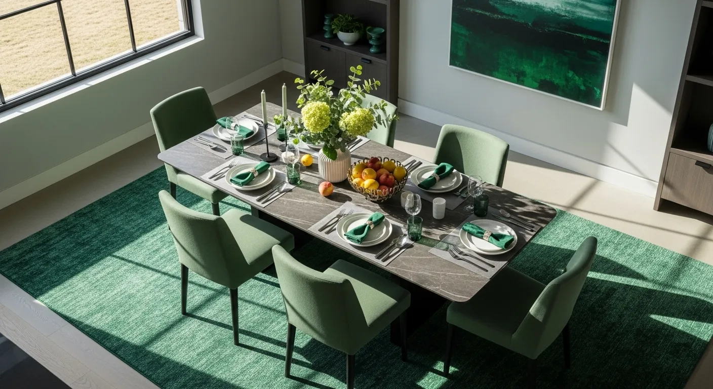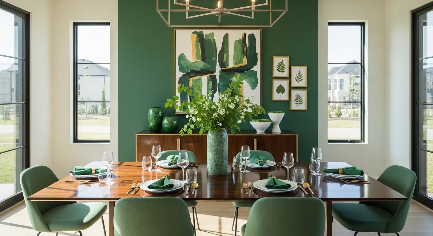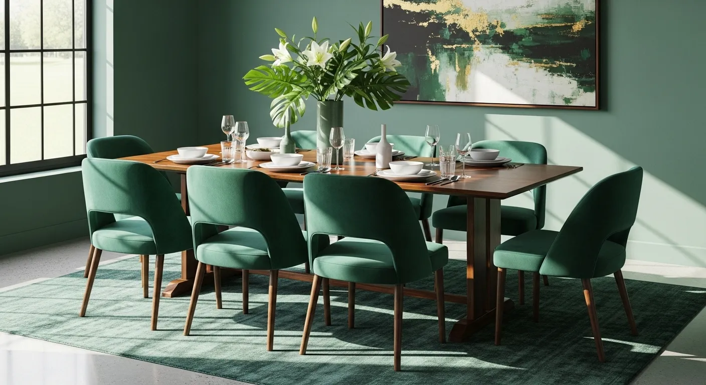 Stylish modern dining room with emerald green decor, summer vibes, and elegant table setting.