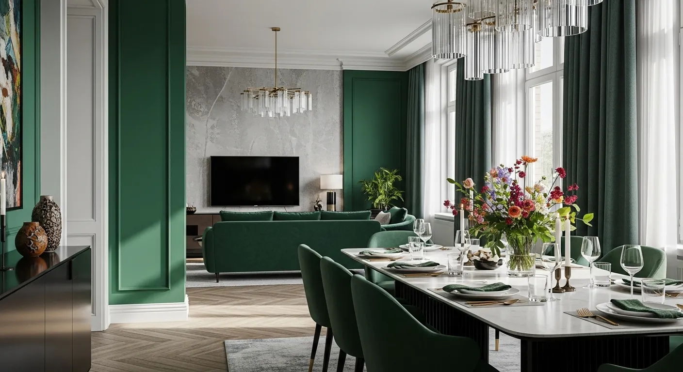 A stylish modern dining room decorated in emerald green, featuring floral arrangements and elegant table settings.