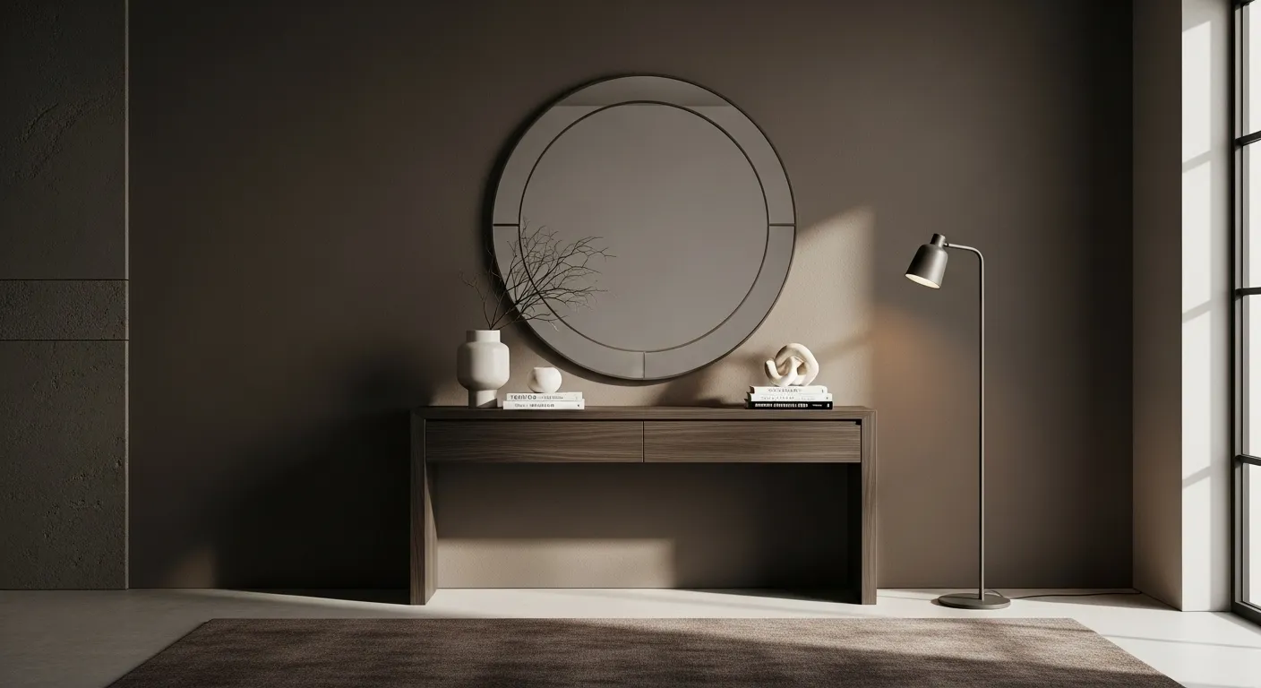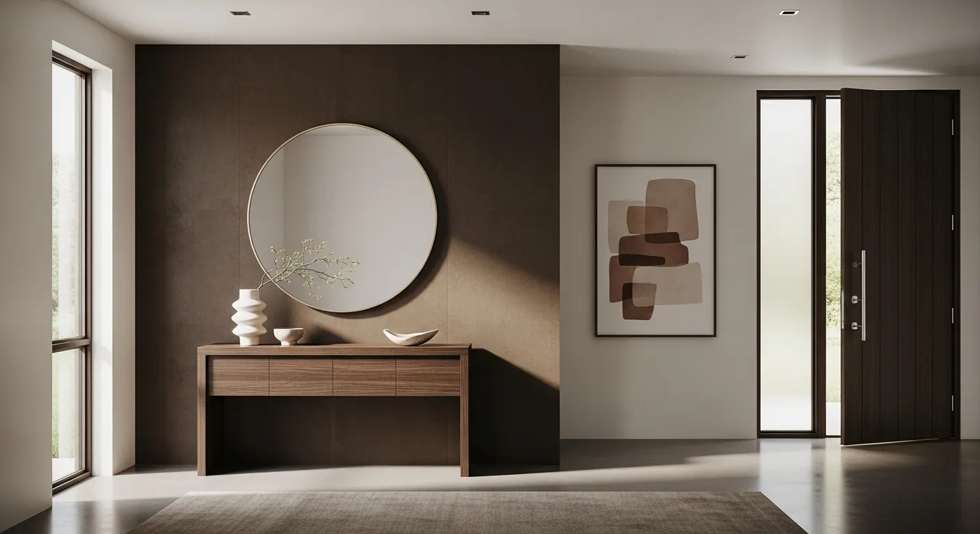 Welcome to a modern entryway that feels warm and inviting! The rich truffle color palette creates a cozy atmosphere, perfect for making a great first impression. This space features a sleek console table paired with a stunning round mirror, reflecting light beautifully. To add a personal touch, consider styling the console with a few curated decor pieces—think a chic vase with fresh greenery or a decorative sculpture. This not only enhances the design but also sets a welcoming tone for your home. You’ll love how this simple tweak can transform your entryway into a stylish oasis!
