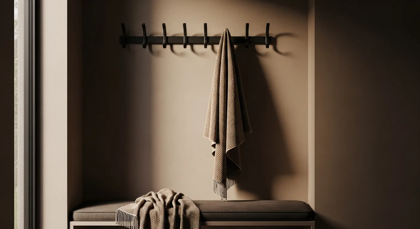 Welcome to your cozy entryway, where modern elegance meets warm vibes! The soft truffle hues envelop the space, creating a serene atmosphere that invites you in. The sleek bench and chic coat hooks add practicality while maintaining a minimalist look. For a personal touch, layer a textured throw or a few decorative objects on the bench. This simple addition can elevate your entryway’s charm and make it feel even more welcoming. Trust me, it’s all about those little details that make a big difference!