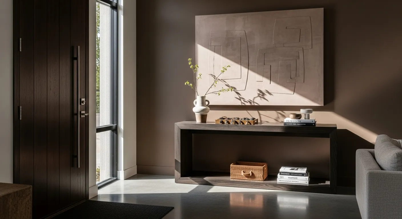 Step into a world of warmth with this modern entryway, beautifully enveloped in a soft truffle palette. The rich, earthy tones create an inviting atmosphere that instantly makes you feel at home. A sleek console table adds a touch of sophistication, while minimal decor keeps it clutter-free. For a practical styling tip, consider adding a simple vase with fresh greenery—it’s a small detail that brings life and warmth to your space. Trust me, your guests will love this cozy welcome!