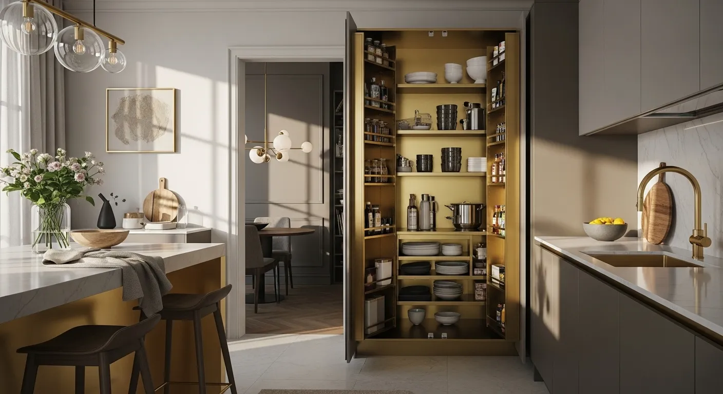 There’s something so inviting about a modern kitchen that embraces a golden color palette! This space radiates warmth with its chic gold accents, making it feel both luxurious and cozy. The sleek cabinetry and organized pantry showcase not just style but functionality too. To create a similar vibe in your kitchen, think about incorporating gold hardware or decor pieces. A simple gold fruit bowl or elegant light fixture can elevate your everyday cooking space into a stylish retreat you’ll love spending time in.