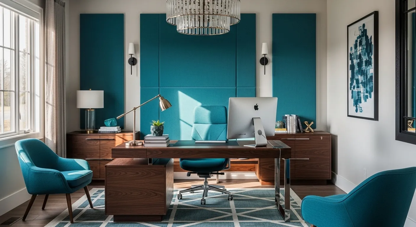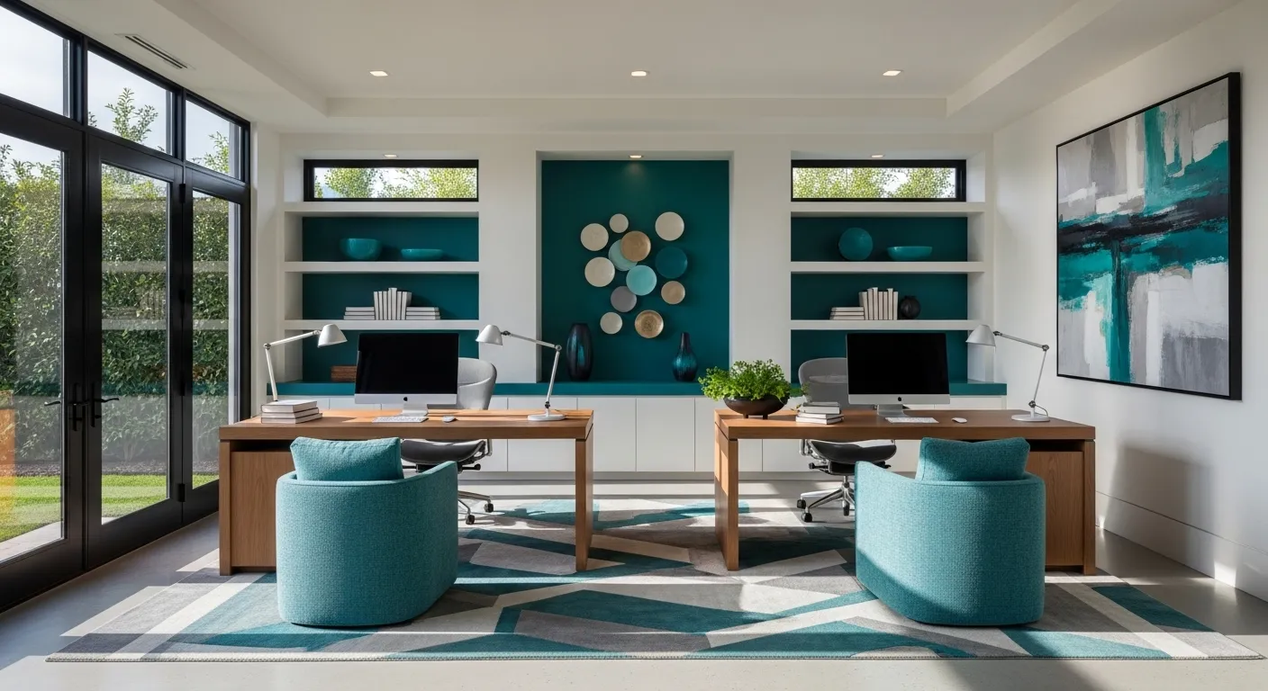 Imagine stepping into a modern home office that instantly lifts your spirits! This stunning space embraces a vibrant teal palette, seamlessly blending energizing tones with calming elements. The sleek wooden desks paired with cozy teal chairs create a friendly and inviting atmosphere. To enhance the mood, consider adding greenery, like a potted plant, for a touch of nature. It’s all about balancing productivity with comfort, and this office nails it! So, if you’re looking to revamp your workspace, don’t shy away from those bold teal hues—they’ll make your daily grind feel a little more joyful!