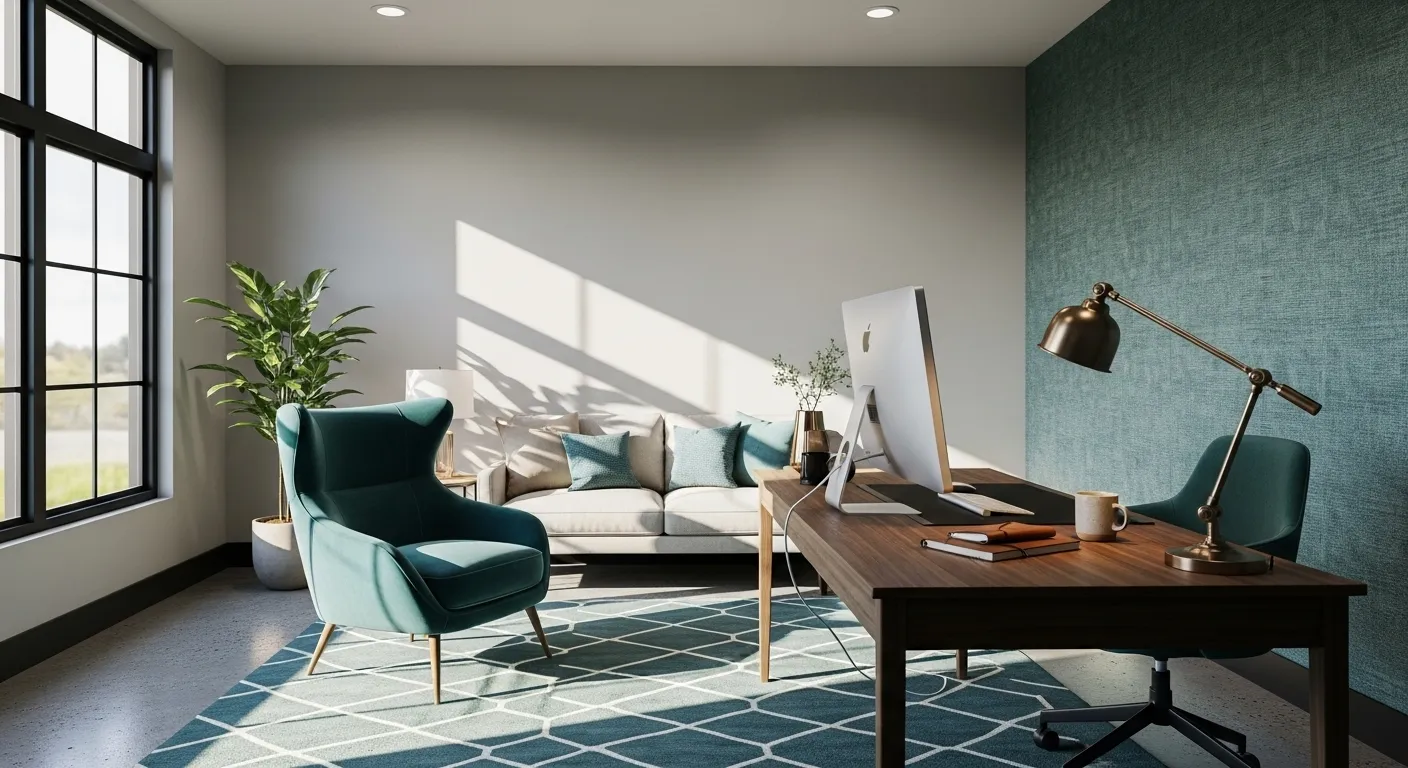 Creating a home office that inspires productivity can be as simple as embracing a fresh color palette! This modern space features stunning teal accents, from the cozy chair to the eye-catching rug. The soothing tones promote creativity while the natural light pouring through the large windows invigorates the atmosphere. To enhance this serene vibe, consider adding a few indoor plants—they not only purify the air but also add a splash of life to your workspace. You’ll love how welcoming and refreshing this setup feels!