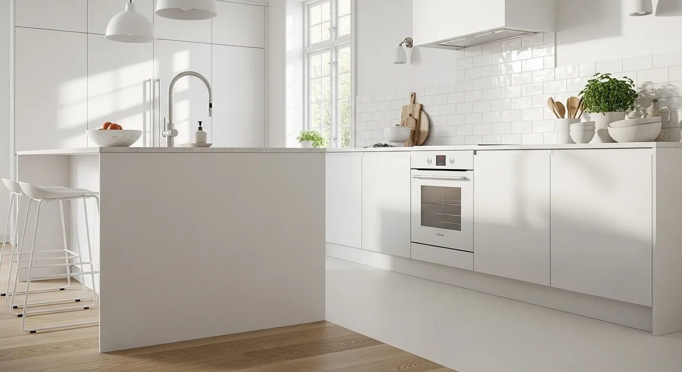 Step into this stunning Scandi kitchen, where white cabinets and sleek countertops create an airy atmosphere that feels both fresh and inviting. The minimalist design, complemented by light wooden accents, brings a touch of warmth to the all-white palette. To enhance this serene vibe, consider adding a few potted herbs on the windowsill — not only do they look beautiful, but they also add a pop of green and a hint of freshness! This kitchen is perfect for everyday life, making cooking and gathering a delightful experience.