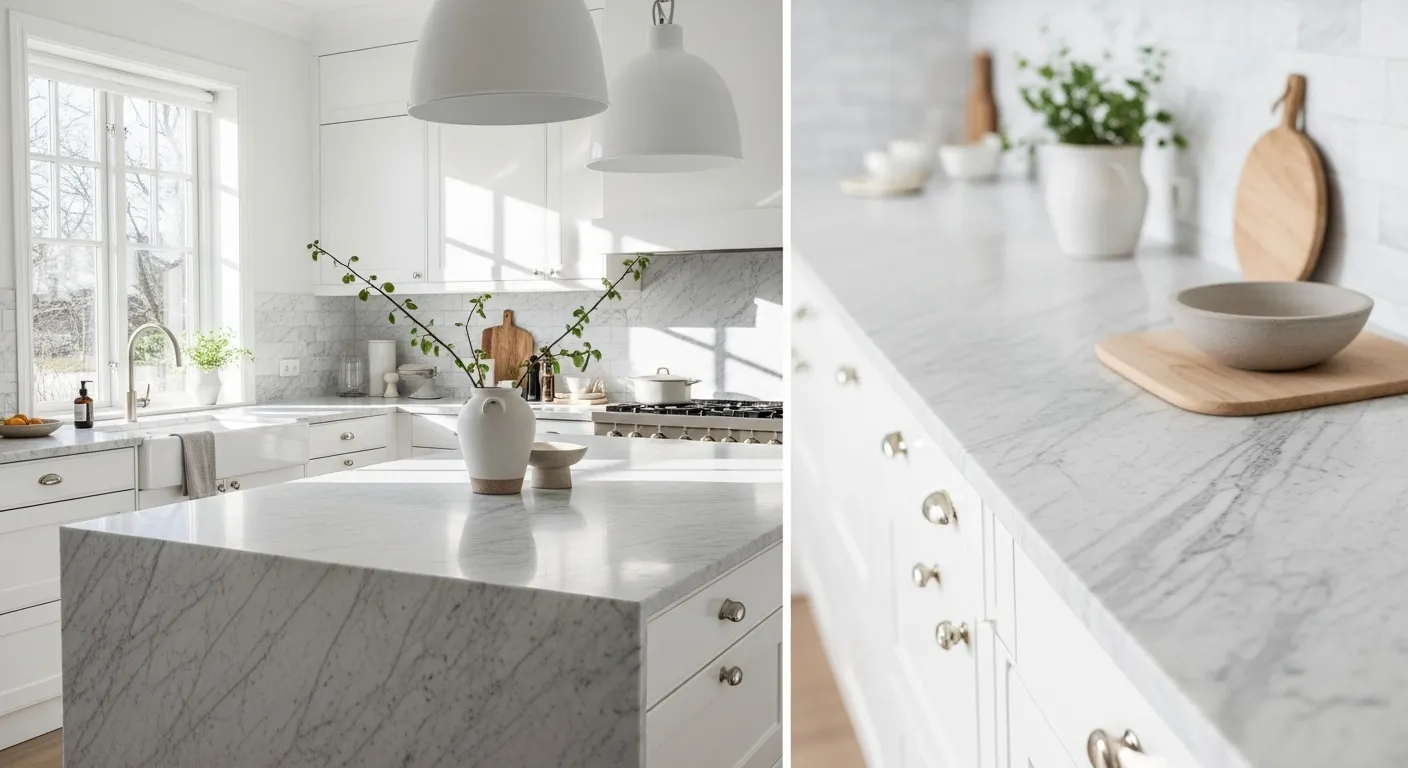 Step into this gorgeous Scandi kitchen, where all the magic happens in bright whites and soft, airy vibes! The white cabinetry and stunning marble countertops create a serene atmosphere that feels both chic and inviting. To enhance that minimalist look, add a splash of greenery with simple potted plants or fresh herbs. Not only do they brighten the space, but they also bring a touch of life to your everyday cooking adventures. Trust me, you’ll love how a few natural elements can soften those clean lines and make your kitchen feel like home!