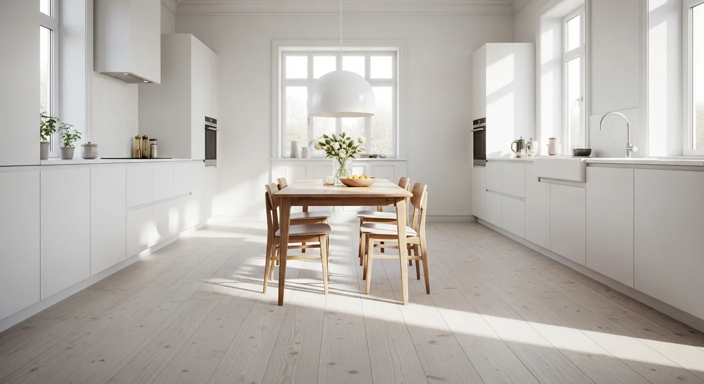 Step into this stunning Scandinavian kitchen, where the all-white color palette creates a serene and inviting atmosphere. The natural light pours in through the large windows, making the space feel airy and open. The light wooden floor complements the sleek white cabinetry, offering a touch of warmth. To add personality, consider incorporating a few potted herbs on the countertop; they not only look lovely but also bring fresh scents and flavors to your cooking! It’s all about creating that cozy feeling while keeping things chic and functional.