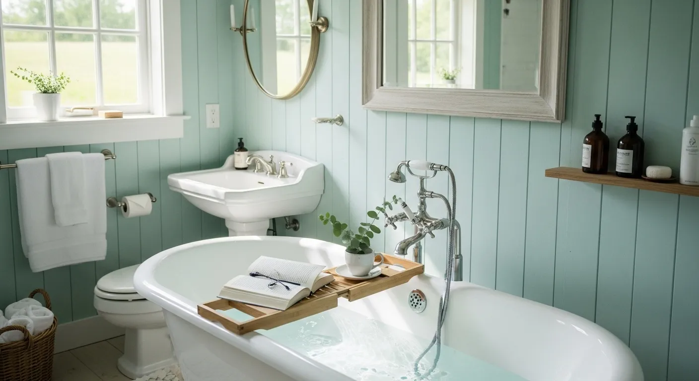 Step into this gorgeous farmhouse bathroom and feel instantly relaxed! The soft pastel mint color on the walls and paneling creates a calm, inviting atmosphere, perfect for unwinding after a long day. The vintage tub and rustic wood accents add a charming touch, while the elegant lighting enhances the cozy vibe. For a practical styling tip, consider adding a few potted plants to bring a bit of nature indoors. They not only purify the air but also enhance the tranquil aesthetic of your space. You’ll love how fresh and serene it feels!