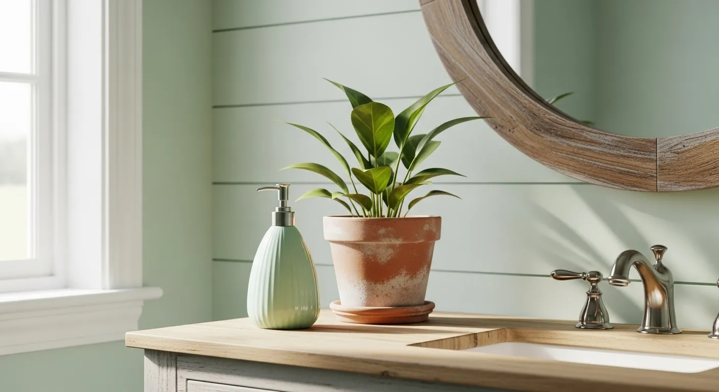 Step into a dreamy farmhouse bathroom adorned in soft pastel mint hues that instantly create a calm and refreshing atmosphere. The gentle mint walls complement the natural wood accents beautifully, while the round mirror adds just the right touch of rustic charm. A potted plant on the countertop breathes life into the space, making it feel vibrant yet tranquil. For a cozy touch, consider adding wooden trays to organize your essentials—it’s functional and enhances that warm farmhouse vibe you’ll love!