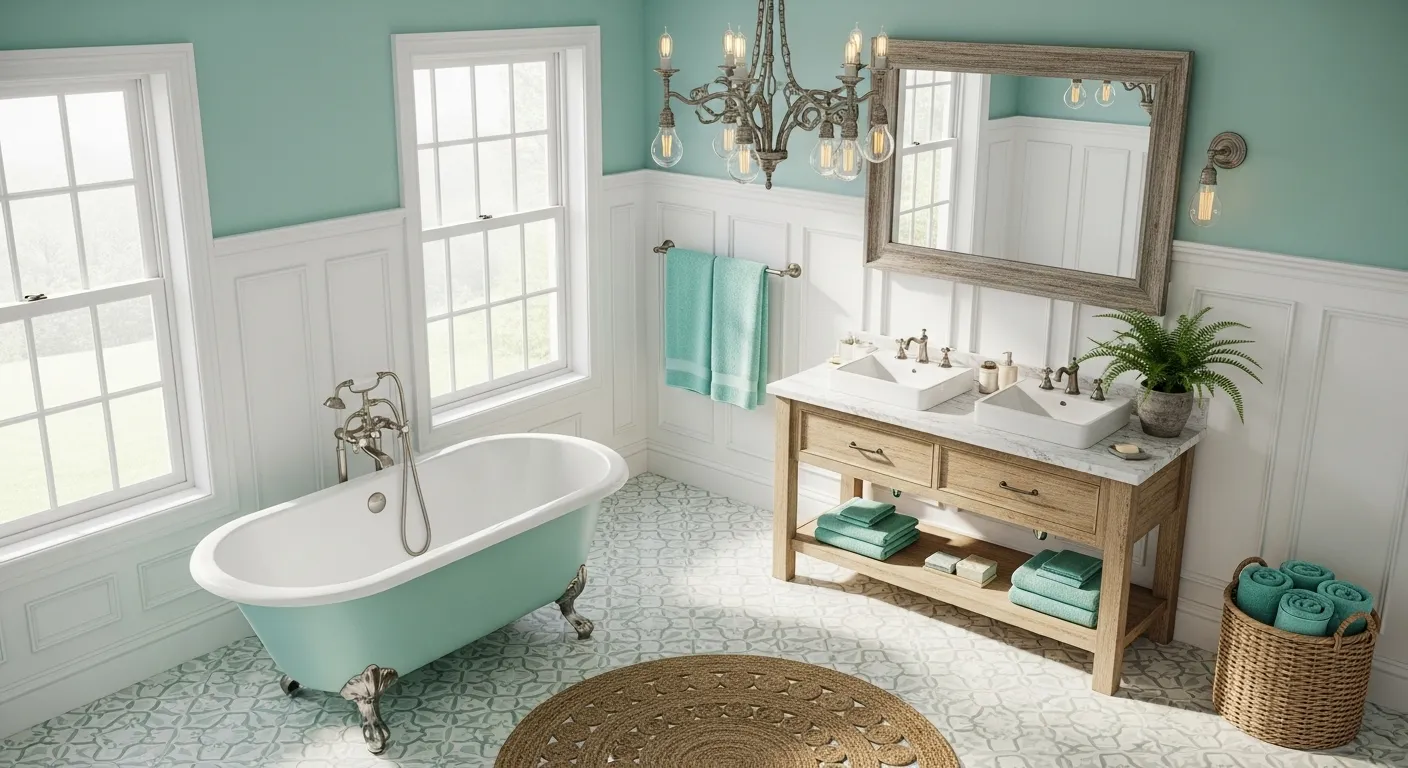 Imagine stepping into a serene bathroom that feels like a cozy retreat! This farmhouse-style bathroom uses a lovely pastel mint color palette, which brings a calming vibe to your everyday routine. The charming tub, paired with elegant accents like the chandelier and earthy wood finishes, creates a delightful contrast that feels fresh yet timeless. For a practical styling tip, consider adding soft, textured towels in similar hues to enhance the cozy atmosphere while tying the whole look together. Trust me, you’ll love how inviting this space becomes!