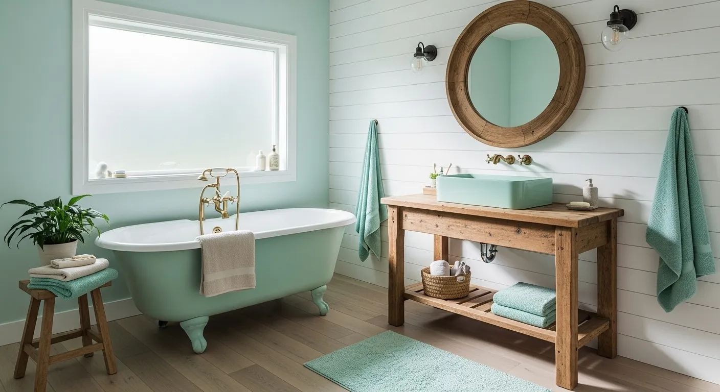 Imagine stepping into a bathroom that feels like a breath of fresh air! This lovely farmhouse bathroom, adorned in soft pastel mint, creates a tranquil oasis perfect for everyday use. The minty hue pairs beautifully with natural elements like the wooden tub tray and potted plants, bringing a serene vibe to your space. A quick tip? Swap out your towels for plush, white ones to keep that fresh, spa-like feel. You’ll love how these small touches elevate your everyday routine!